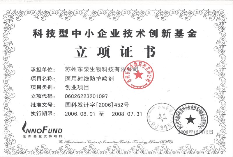 1. 獲科學(xué)技術(shù)部科技型中小企業(yè)技術(shù)創(chuàng)新基金管理中心頒發(fā)的《科技型中小企業(yè)技術(shù)創(chuàng)新基金立項(xiàng)證書(shū)》 。立項(xiàng)代碼:06C26223201097