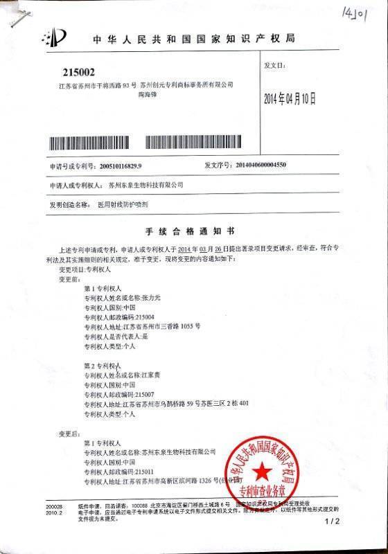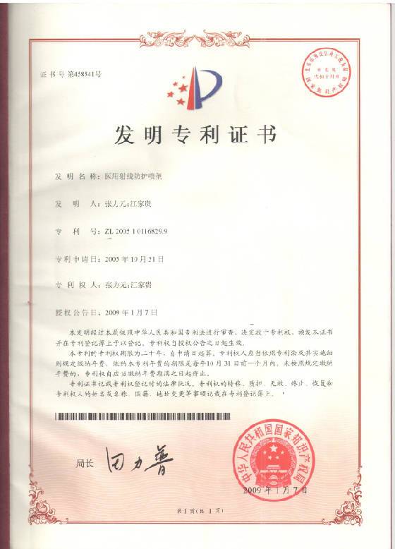 醫(yī)用射線防護(hù)噴劑發(fā)明專(zhuān)利證書(shū)
